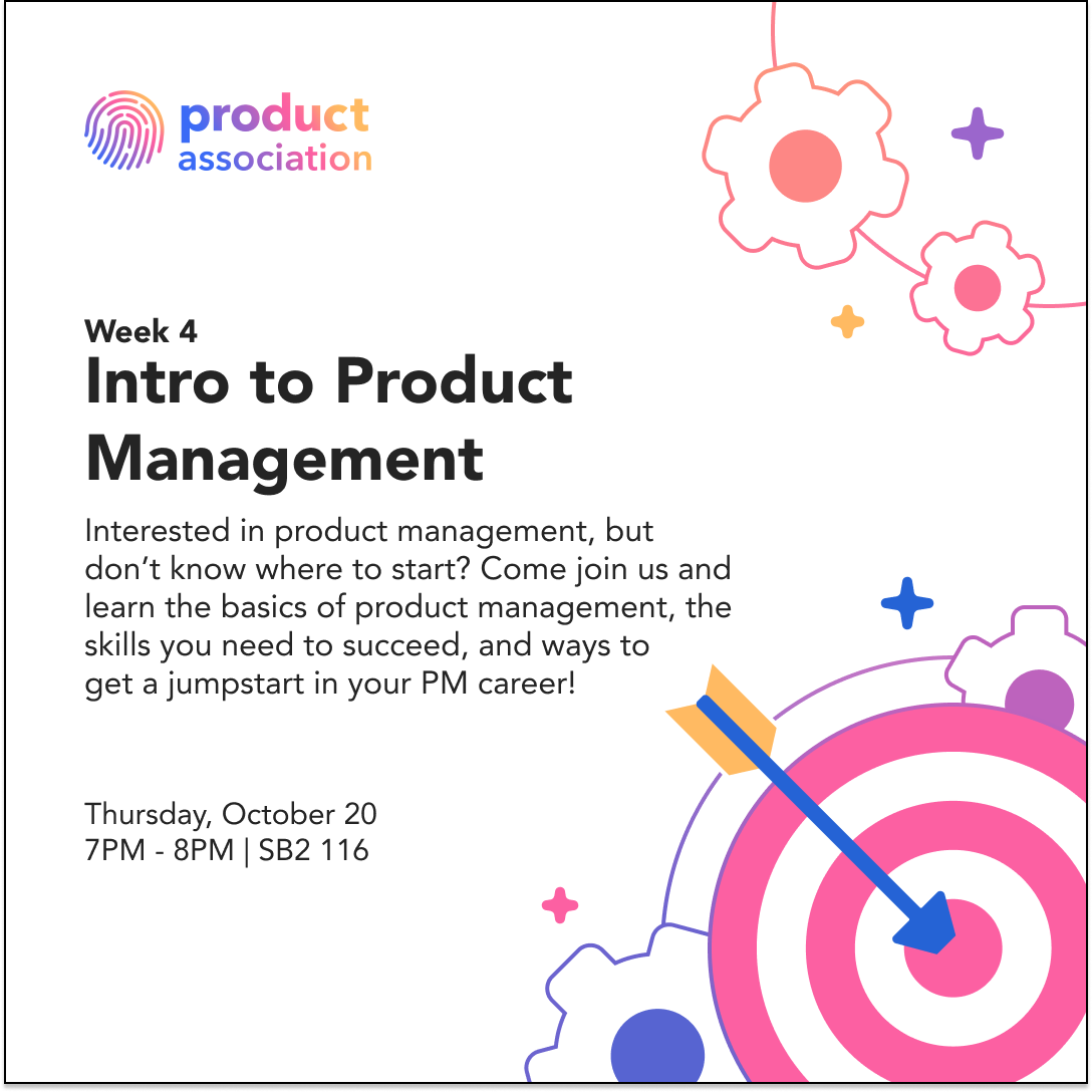 Whether you want to know what product management is or want to know how to get jumpstart your career in product management, come to our meeting this Thursday, October 20 from 7PM - 8PM at SB2 116! We will cover the basics of product management and the skills needed to succeed.